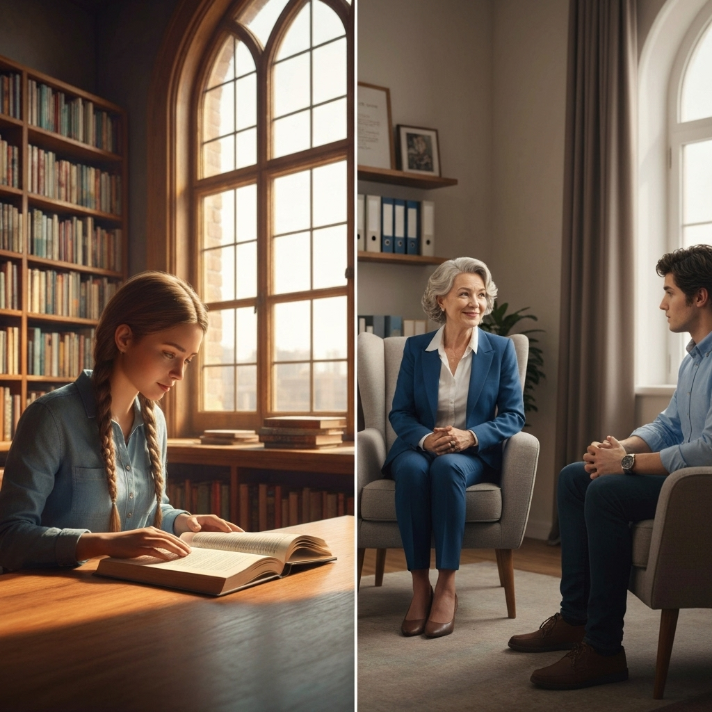 Content generation Prompt: "A split-screen image. Left: A person exploring an open book in a sunlit library. Right: Two figures, a therapist and patient, in a therapy session. Both are available."