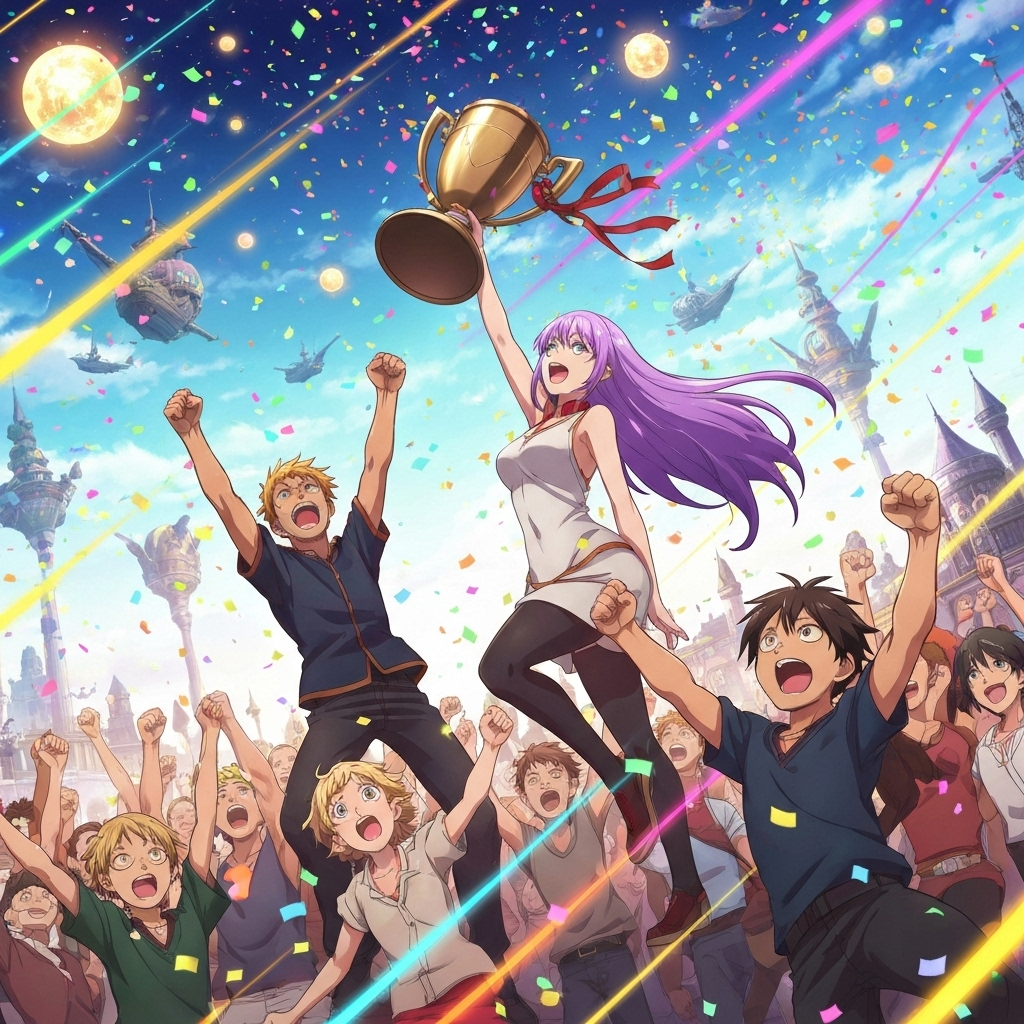 Content generation Prompt: "Anime style, a triumphant team raising a trophy, confetti falling, cheering crowd, dynamic pose, vibrant colors, celebratory atmosphere, epic background."